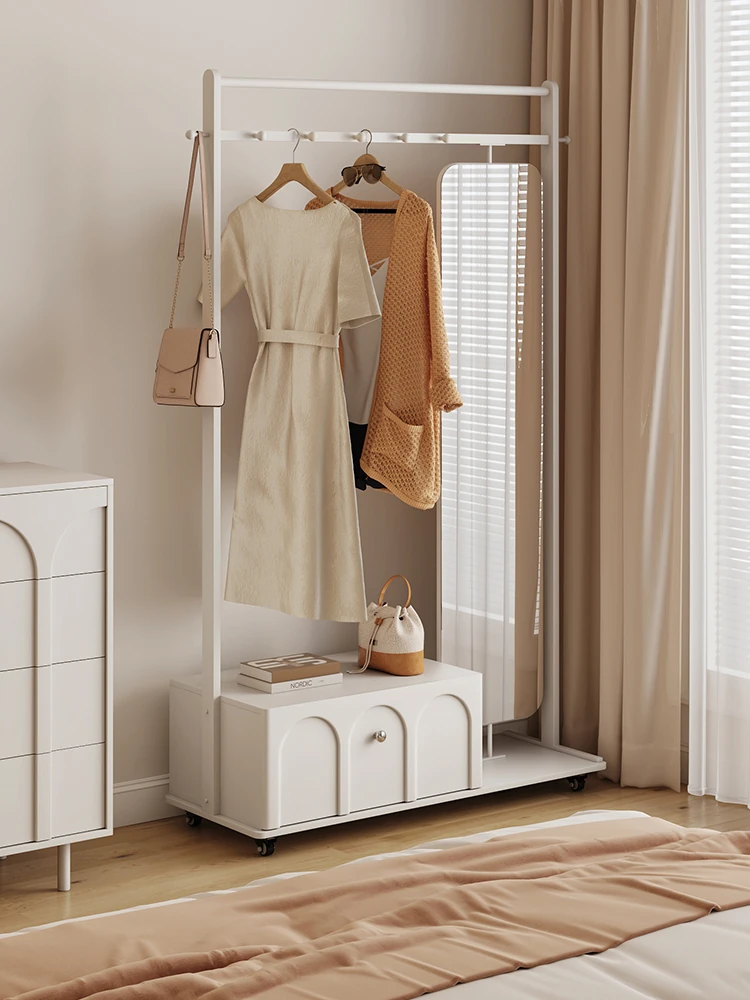 フランス風クリームカラーの多機能衣類ハンガー付きミラーキャビネット - 移動可能で便利なベッドサイド収納、コンパクトなデザインでお部屋をスタイリッシュに演出!
