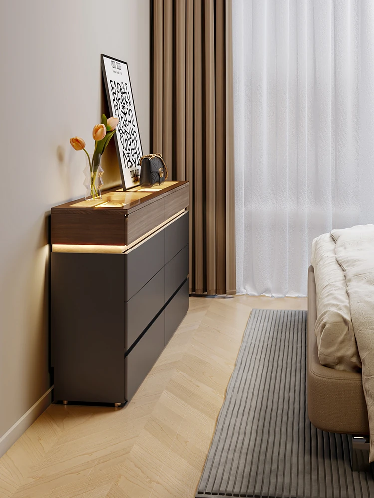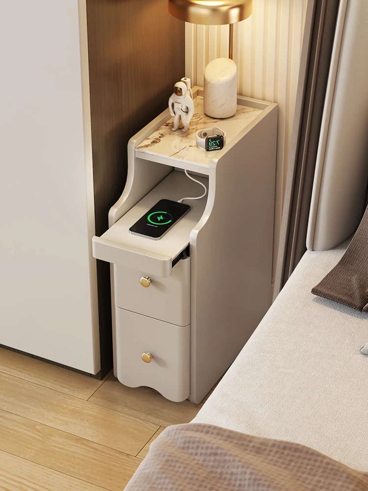 スリムデザインのベッドサイドキャビネット - 超薄型30CM、LEDライト付き、壁寄せ収納で主寝室をスッキリ整理!おしゃれで機能的な収納ソリューションです。