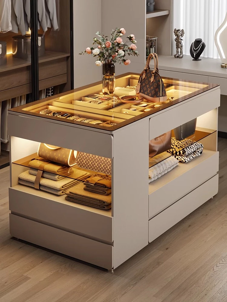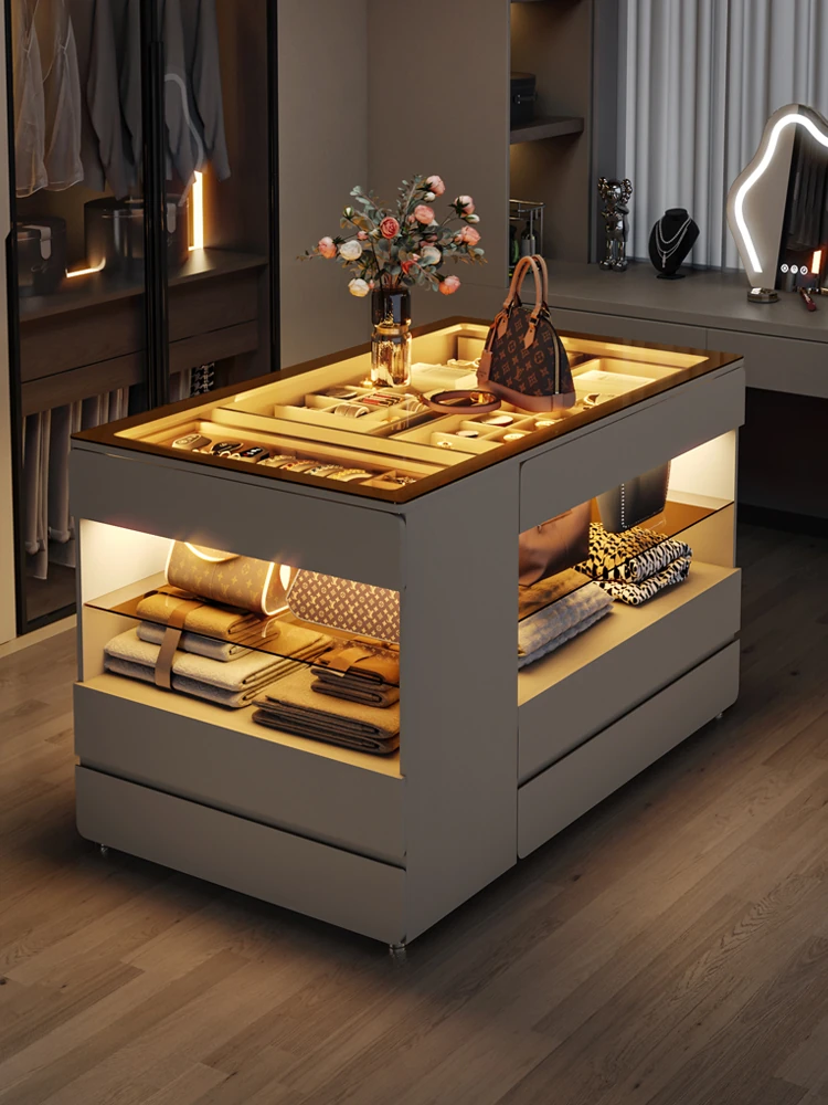ウォークインクローゼットのアイランドカウンター ジュエリーディスプレイキャビネット シンプルで高級感あふれるホワイト 家庭用フロアスタイルの宝石収納 豪華な収納キャビネット