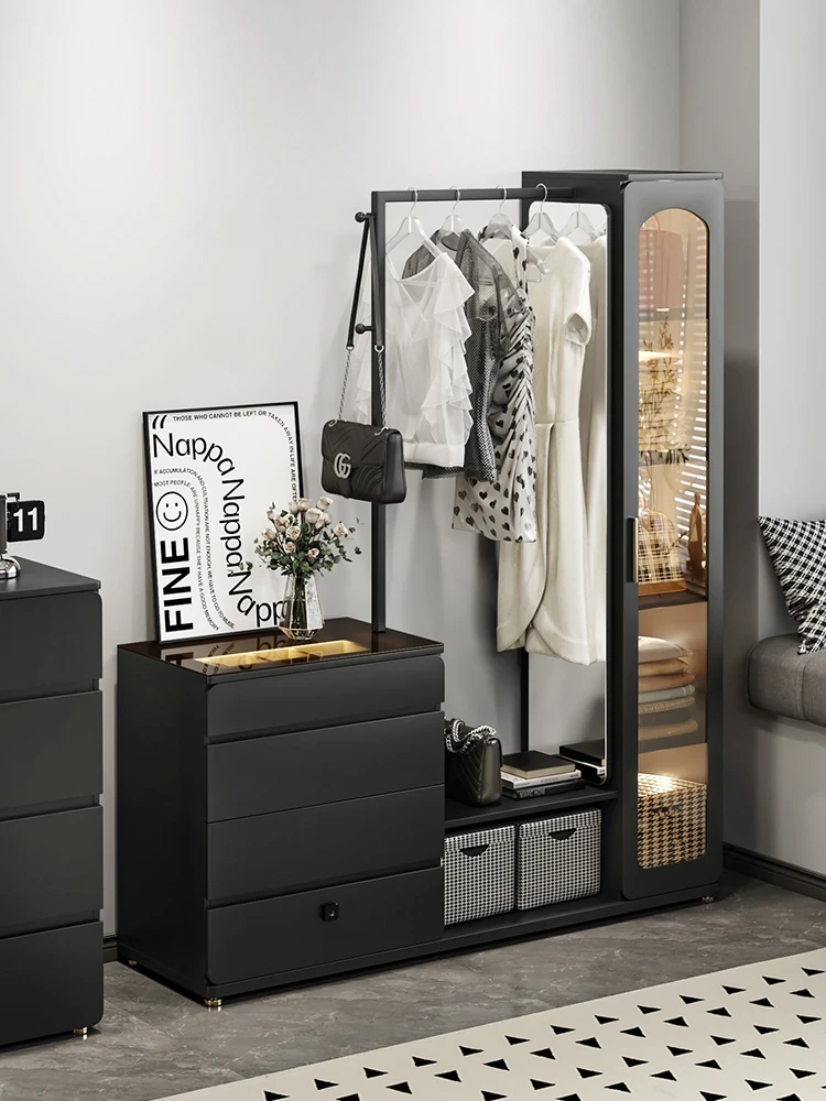 新作!黒色のベッドサイド収納キャビネット兼衣類ハンガー、ミラー付きでお部屋をスッキリ整理!機能的でスタイリッシュなデザイン、あなたの寝室にぴったりなアイテムです。
