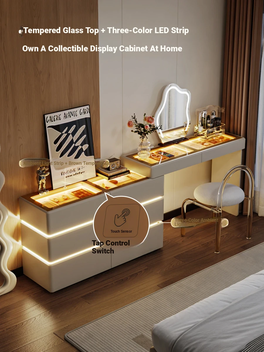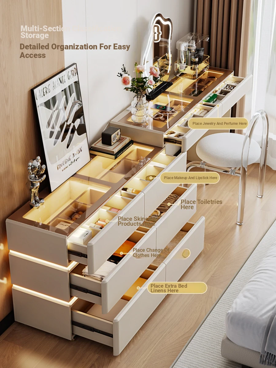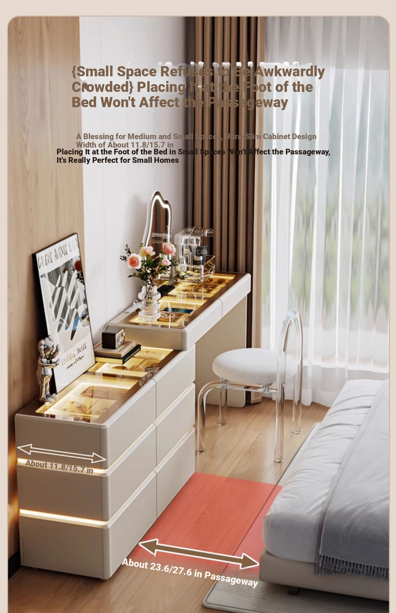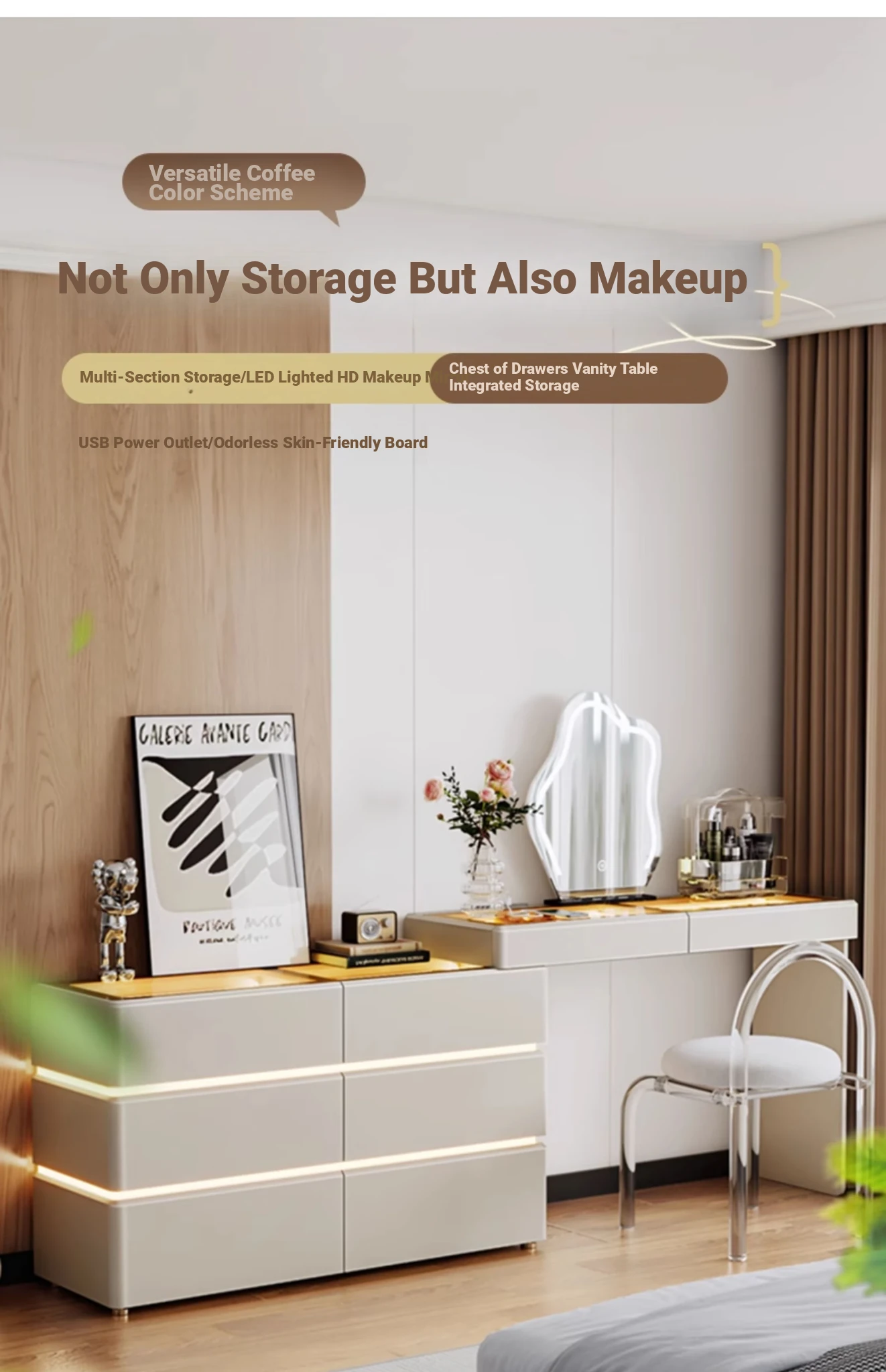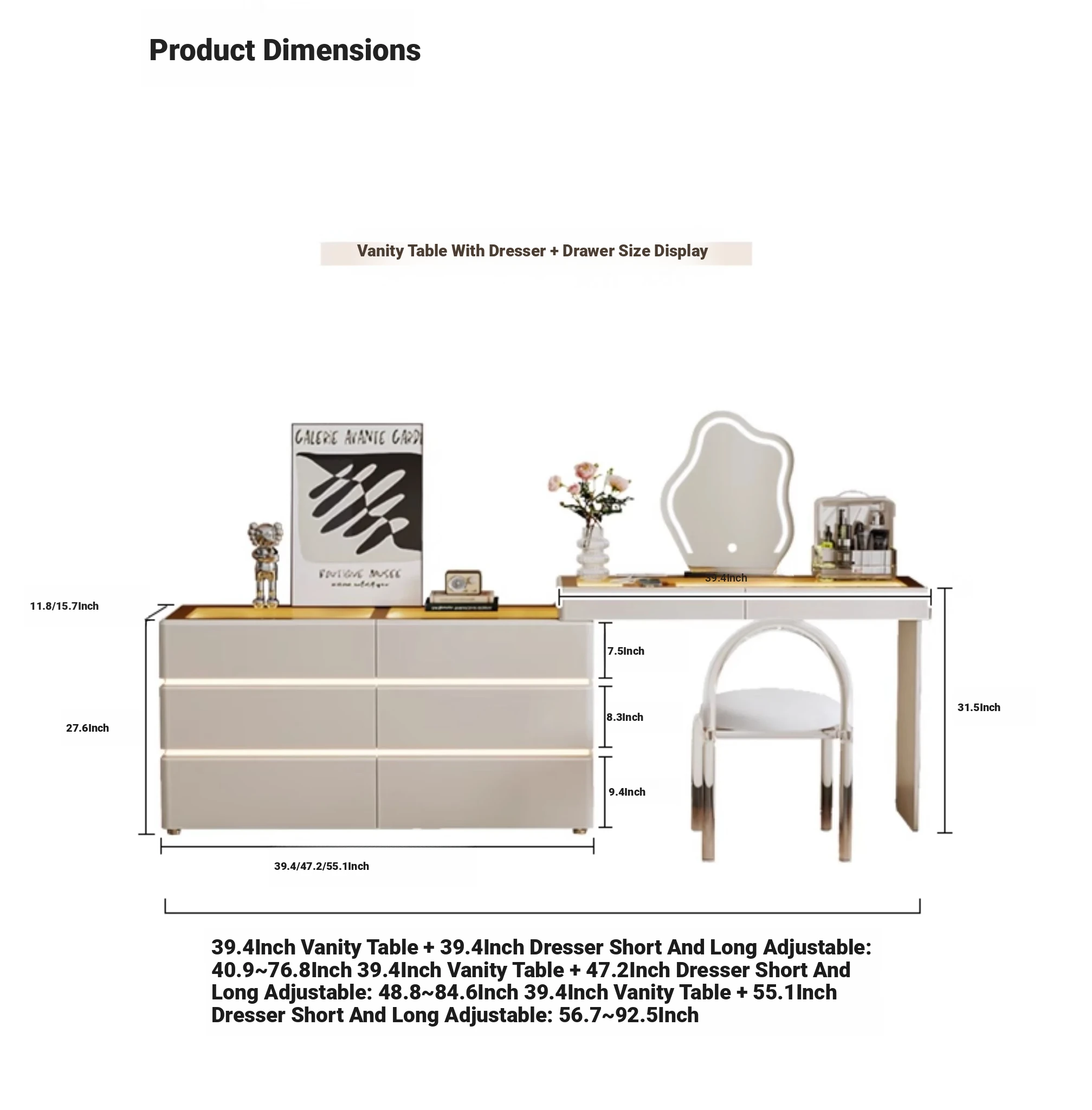 Elegant Slim Makeup Vanity with Integrated Dresser - Ideal for Small Spaces, Features Expandable Design for Bedroom Use, Perfect for Stylish and Luxurious Living!