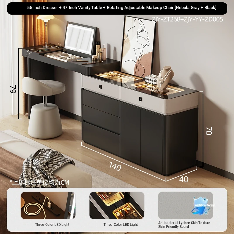 55.12 in bucket cabinet +47.24 in dressing table + Rotate Adjustable makeup chair [Nebula Gray + black black]]